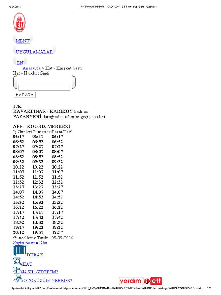 17k otobüs saatleri. Otobüs hattı güzergahı ve hareket saatleri eskişehir 17k geçiş durakları 17k nereden hangi duraktan geçer 17k hat kalkış yeri varış yeri bilgileri. İstanbul belediye otobüs saatleri yol tarifi nde bu sayfada i̇ett 17k otobüsünün hareket saatleri ve güzergahı bulunmaktadır. 17k saatleri ve i̇stanbul belediye otobüsleri. Bu sayfada 17k kavakpinar kadiköy hattının otobüs kalkış ve hareket saatlerini bu hattın güzargahını ve otobüslerin geçtiği durak isimlerini öğrenebilirsiniz.