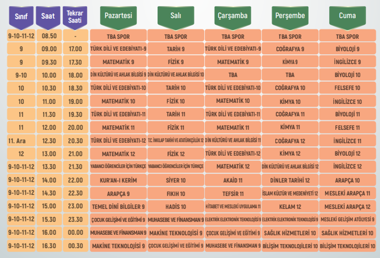 Eba tv lise ders tekrar saatleri. Sınıf dersleri ile başlıyor. Lise 9 sınıf öğrencileri 09 00 ile 10 00 arasında üç ders görebilecekken lise 10 sınıf öğrencileri üç dersi 10 30 ile 11 30 arasında alacak. Liseler için ise 09 00 da 9.